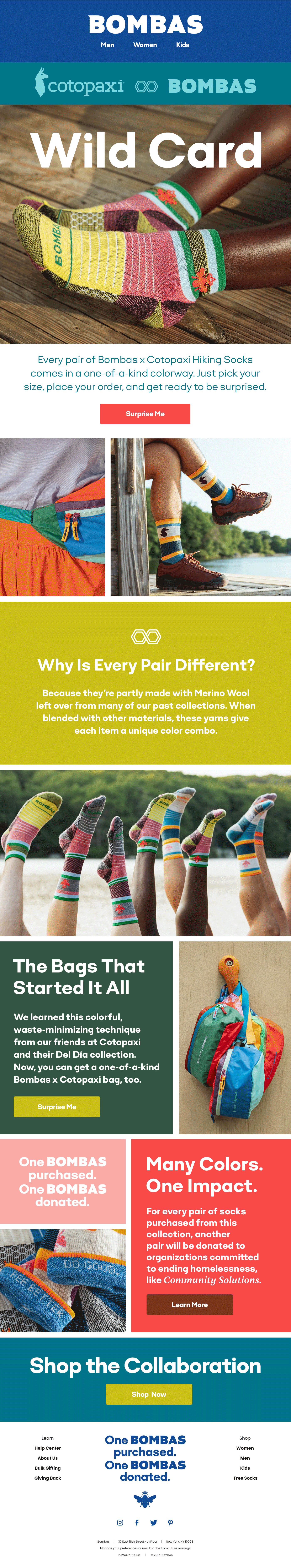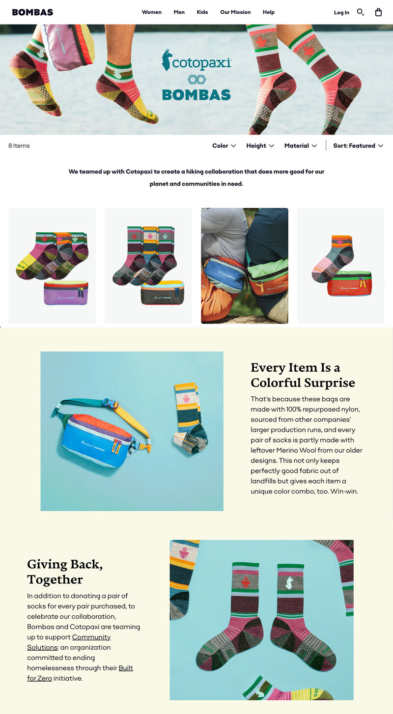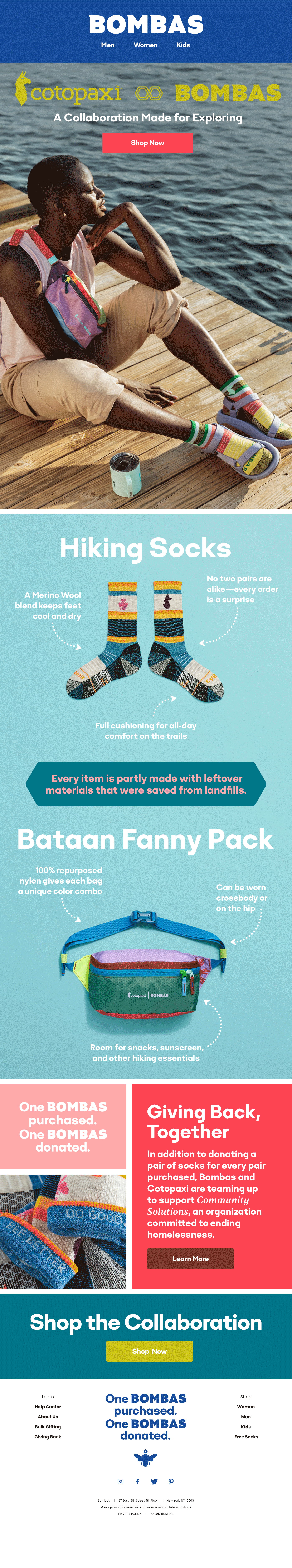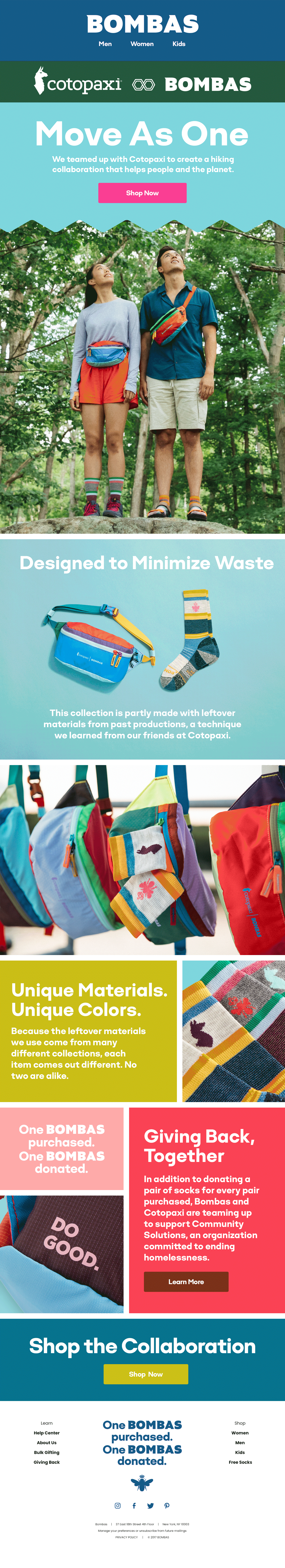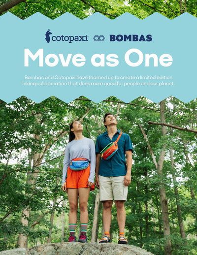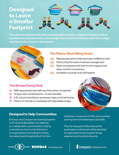 Move As One: Two B Corps, one mission: to make a difference together. Cotopaxi and Bombas teamed up to create the Cotopaxi x Bombas Hiking Collection—socks and bags made from remnant materials, preventing landfill waste. Each purchase not only saves unique fabrics but also supports those in need, with donations reaching vulnerable communities through Outreach Teams.