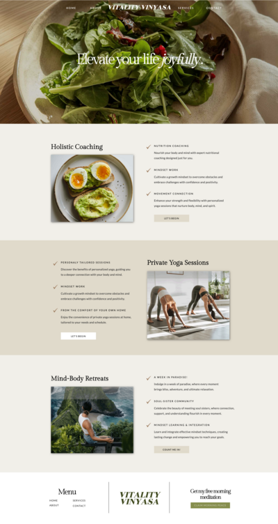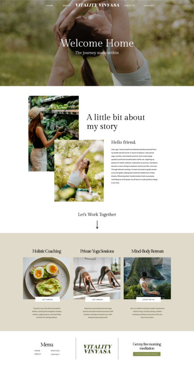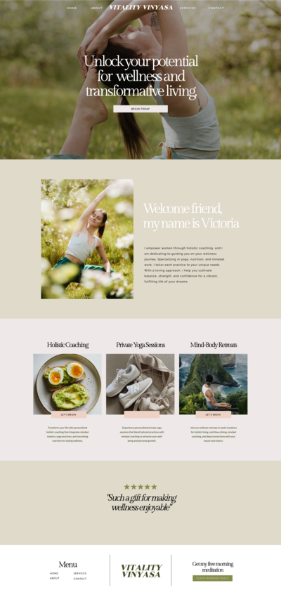 For this project, we partnered with Victoria—a wellness coach and yoga practitioner—to bring her vision of transformational living to life. Through warm, grounded visuals and a spacious, elegant layout, we crafted a website that feels as nourishing as her offerings. Every detail, from typography to tone, was designed to reflect her holistic approach, inviting visitors into a world of alignment, vitality, and self-discovery.
